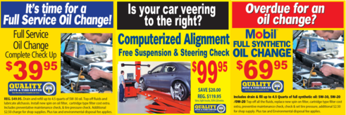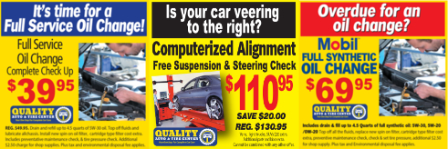 At Quality Auto & Tire Center we work hard to help your car repair costs stay low, and we are dedicated to your savings. To save more on car repair prices, check here every month for our auto service specials and coupons we offer. Whether you need a basic oil change or your check engine light is on, it’s very likely that watching our “specials” page can benefit you.